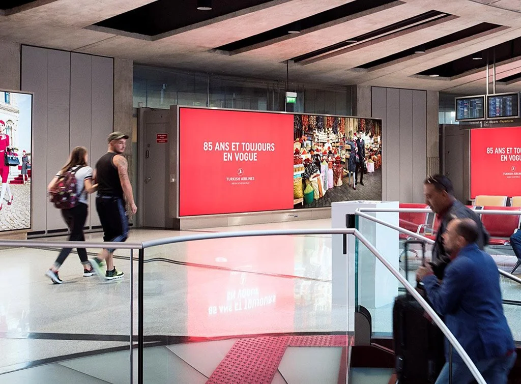 Les grands formats, écrans digitaux et dispositifs spectaculaires dans les halls d’arrivée et de départ créent un impact immédiat. Ils permettent de générer une forte visibilité de marque auprès de tous les visiteurs entrant dans l’aéroport.